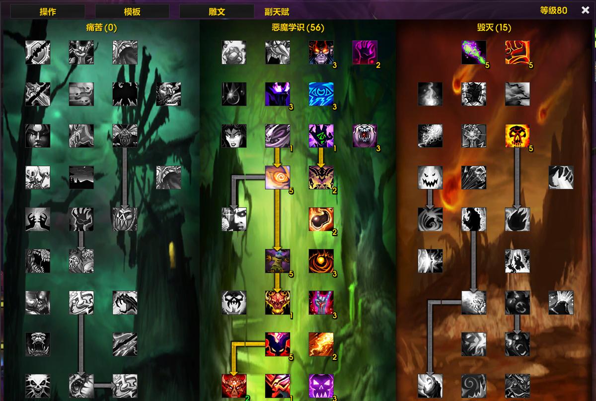 技能优先级:保持厄运和腐蚀,献祭,然后是烧尽(仅在触发熔火之心时使用),最后是暗影箭。