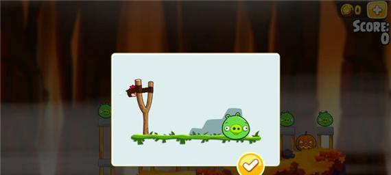 在这个关卡中,我们需要控制红色小鸟把木板上的绿色猪全部消灭。通过调整发射的角度和力度,使得小鸟能够精准地撞击到目标。